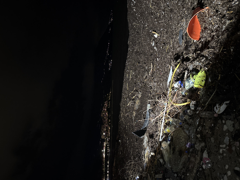 Night view of a shoreline littered with trash