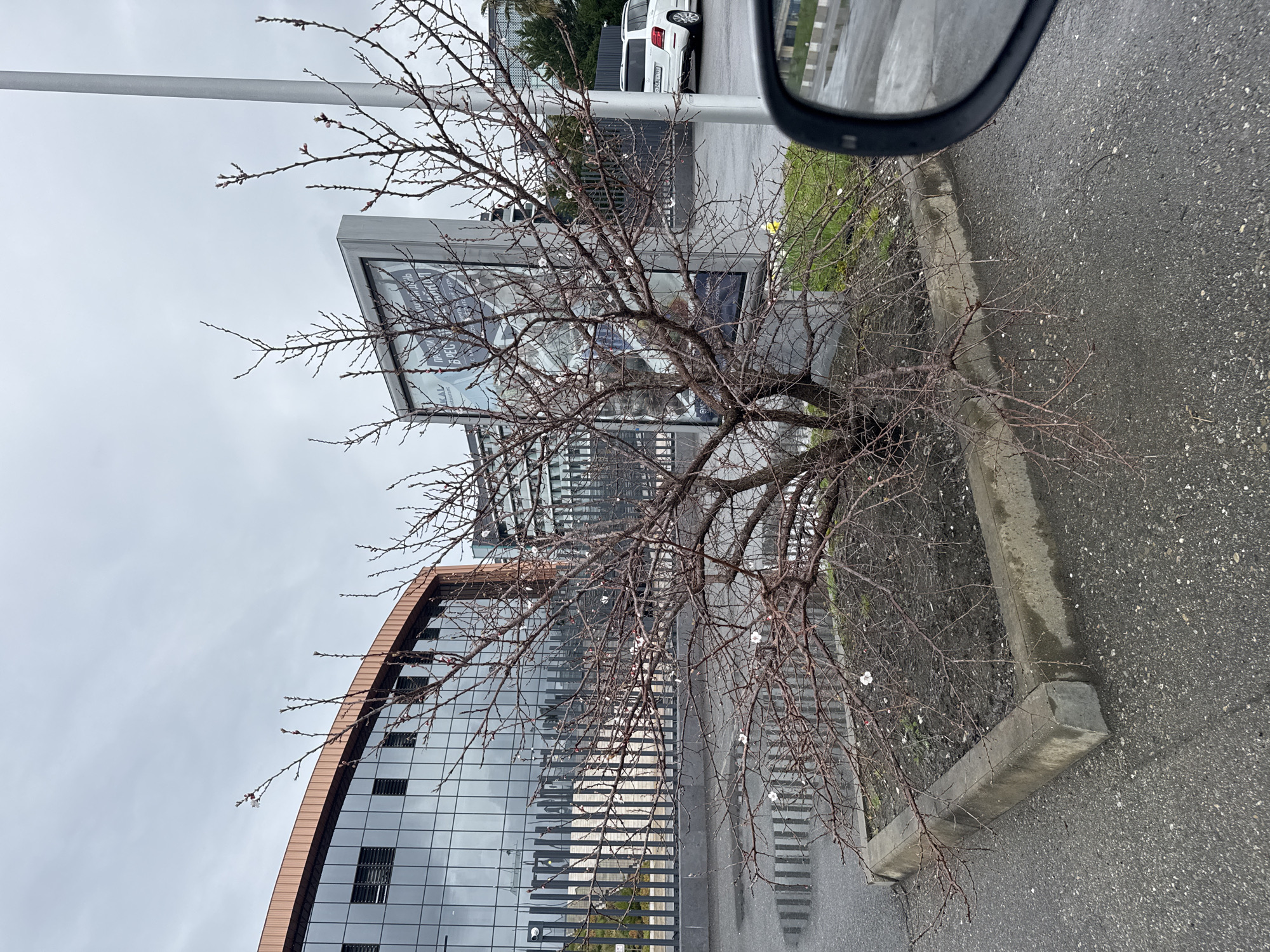 The image captures an outdoor scene in an urban environment, possibly in Sirius, Russia, though this cannot be definitively confirmed without further context. A bare tree stands in a concrete planter adjacent to a wet asphalt surface. In the background, a modern building with a curved roof and mirrored glass façade reflects the cloudy sky. A white vehicle is partially visible behind a fenced area in the middle ground. To the right, a car side mirror is partially visible. The tree has a few small white blossoms. A street light is visible in the background. The sky is overcast. The scene appears to be taken from inside a vehicle.