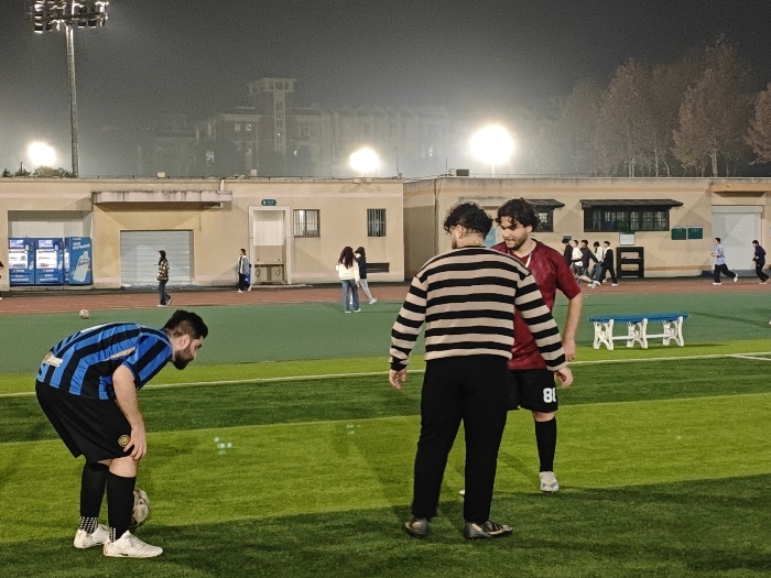 The image displays an illuminated artificial turf soccer field at night in the city of Unknown, Unknown. In the foreground-left, a male with dark hair and a beard, wearing a blue and black striped soccer jersey, black shorts, and white athletic shoes, is bent over, observing a white soccer ball at his feet. In the foreground-center-right, two males stand on the turf, facing each other. One, viewed from the back, wears a horizontal beige and black striped long-sleeved shirt and black pants. The other, partially visible, wears a maroon athletic shirt with the number "81" on his dark shorts and white athletic shoes. The background features a single-story, tan-colored building bordering the field, with multiple doors and windows. Beyond this building, trees with bare branches and taller structures are discernible through a hazy or misty atmosphere. The entire area is brightly illuminated by multiple stadium floodlights mounted on tall poles. On the track surrounding the artificial turf, various individuals are present: on the far left, a person in a plaid shirt walks to the left past two blue vending machines; further right, a person in a white top walks to the right; a group of approximately 5-7 individuals stands near a doorway; and on the far right, at least two individuals are jogging to the right. A light blue metal bench with white supports is situated on the track area towards the center-right.