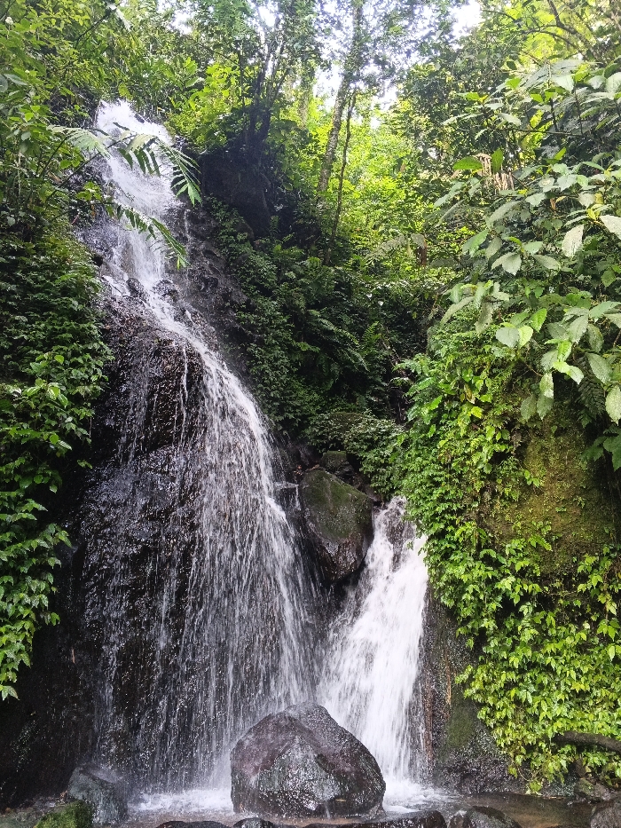 A lush waterfall cascades down a rocky, plant-covered cliff. Two main streams converge at the bottom, near dark, wet stones. Dense green foliage frames the waterfall, creating a tropical, vibrant scene. The vegetation varies from large leaves to delicate vines, emphasizing the natural, untouched environment. Sunlight filters through the trees, highlighting the cascading water and verdant greenery.