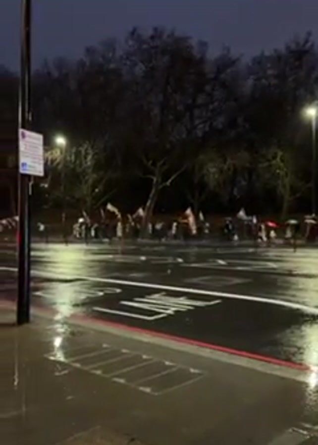 street scene at dusk or dawn, likely in a city. It's raining, and the pavement is wet and reflective. There's a crowd of people on the other side of the street, some holding flags. Streetlights are illuminated, providing the primary light source. Trees line the street in the background. There are road markings on the street in the foreground.