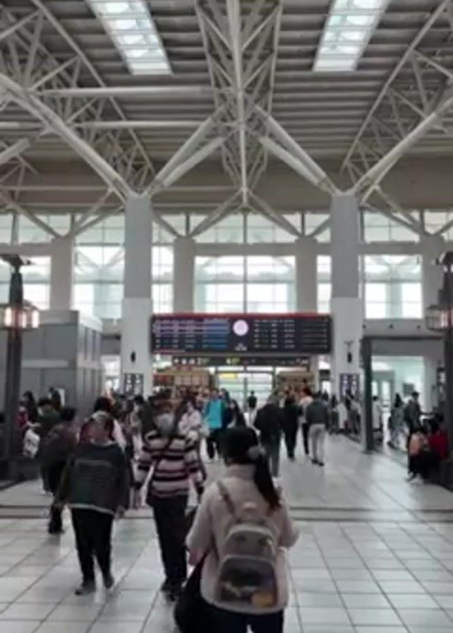 interior of a large transportation hub, possibly a train station or airport. The space features a high ceiling with a visible white metal framework and skylights. People are moving about, some with luggage, suggesting travel. A large electronic board displaying schedules is visible in the center. The floor is tiled in a light color. People are walking, and some are talking. The atmosphere appears busy and active.