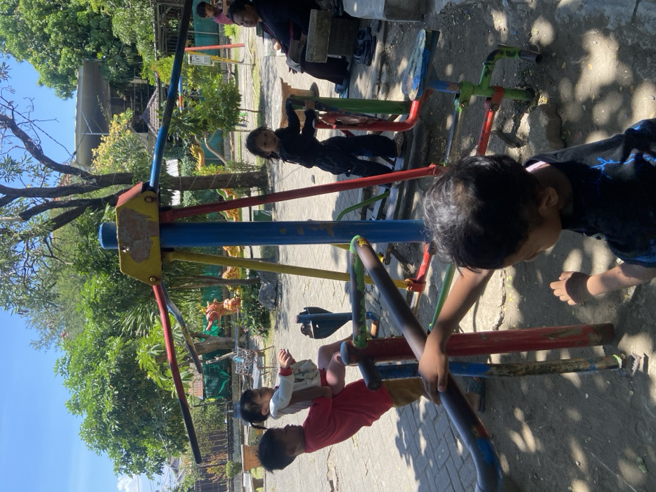 An outdoor scene in Pagerwojo, Indonesia, depicts a sunlit playground environment with children and adults present