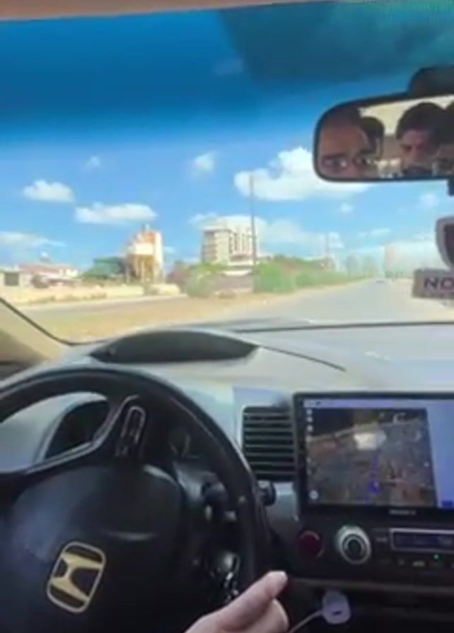 interior of a car, likely a Honda, driving on a paved road in a sunny, urban area. The driver, wearing a black shirt and glasses, has both hands on the steering wheel. The car's dashboard displays a navigation system, with the route displayed on the screen. Two men are visible in the rearview mirror. Another individual in the passenger seat films the driver and then angles the camera upwards to show a smartphone attached to the rearview mirror, apparently showing the same navigation route. The street outside contains buildings, vegetation, and streetlights. Loud, rhythmic music plays in the background.