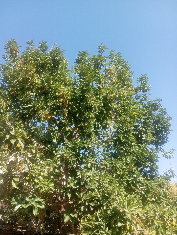 - "The image displays a mature avocado tree, heavily laden with numerous small, green, unripe avocado fruits visible among its dense, dark green foliage" by FM-KfFx13, licensed under CC BY 4.0
