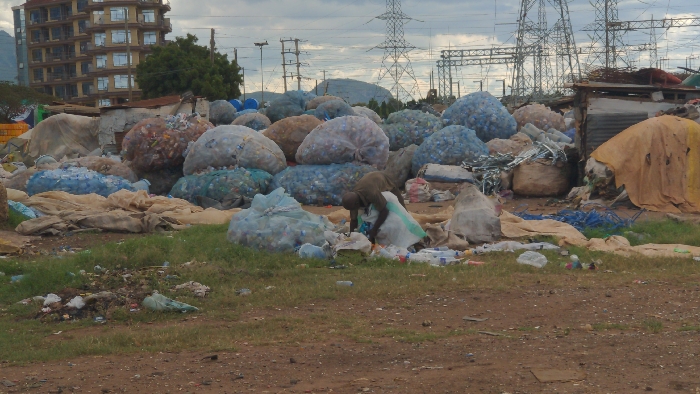 This image portrays an outdoor waste accumulation and sorting area in Morogoro, Tanzania