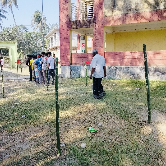 A line of people stands behind a bamboo barrier with red flags marking spacing. An older man in a white shirt and dark lungi walks near the barrier. The scene appears to be outside a brick building with an open balcony. A grassy area and scattered trash are in the foreground. Palm trees are visible in the distance, suggesting a tropical or subtropical location.