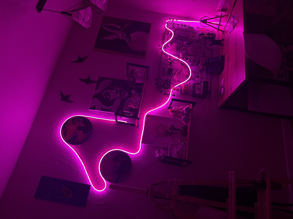 This image depicts an interior room in Rostov-on-Don, Russia, illuminated predominantly by pink/magenta light. A flexible neon-style LED strip traces an irregular, organic shape on the light-colored wall, serving as a primary light source. Additional pink light emanates from a geometric pendant lamp fixture suspended from the ceiling in the upper right. The wall is decorated with multiple items: - A dark, rectangular framed artwork is positioned in the upper left. - Below this, a circular mirror or framed artwork is visible. - Another circular framed artwork, possibly depicting a landscape, is located centrally at the top. - Three black, bird-shaped wall decorations are arranged diagonally mid-wall. - A rectangular framed artwork displaying a stylized female face is situated below the bird decorations. - To the right of the female face artwork, a rectangular framed artwork depicts a stylized fox head in profile. - A wooden shelf is mounted below the female face artwork, holding a small framed picture, a potted plant, and a plush toy. - Adjacent to the shelf on the right, a black wire grid board is affixed to the wall, adorned with papers, photographs, and decorative foliage. An unpopulated wooden art easel stands partially visible in the lower-left portion of the room. In the lower-right, a light-colored wooden desk is present, accompanied by a white chair with a minimalist design. On the desk surface, a black container, a miniature easel with a small canvas, and several papers or cards are visible. The scene is static, devoid of individuals or active interactions.