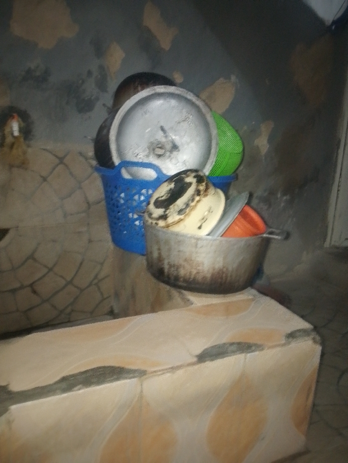 A collection of used kitchen pots and containers sit stacked on a tiled surface. A blue plastic basket holds metal pots and lids, along with a green colander. An aluminum pot with burnt food residue on the exterior leans precariously over the edge, containing an orange plastic container and silverware. The background consists of a patterned tiled wall and a dimly lit corner, contributing to the scene's cluttered and unkempt feel.