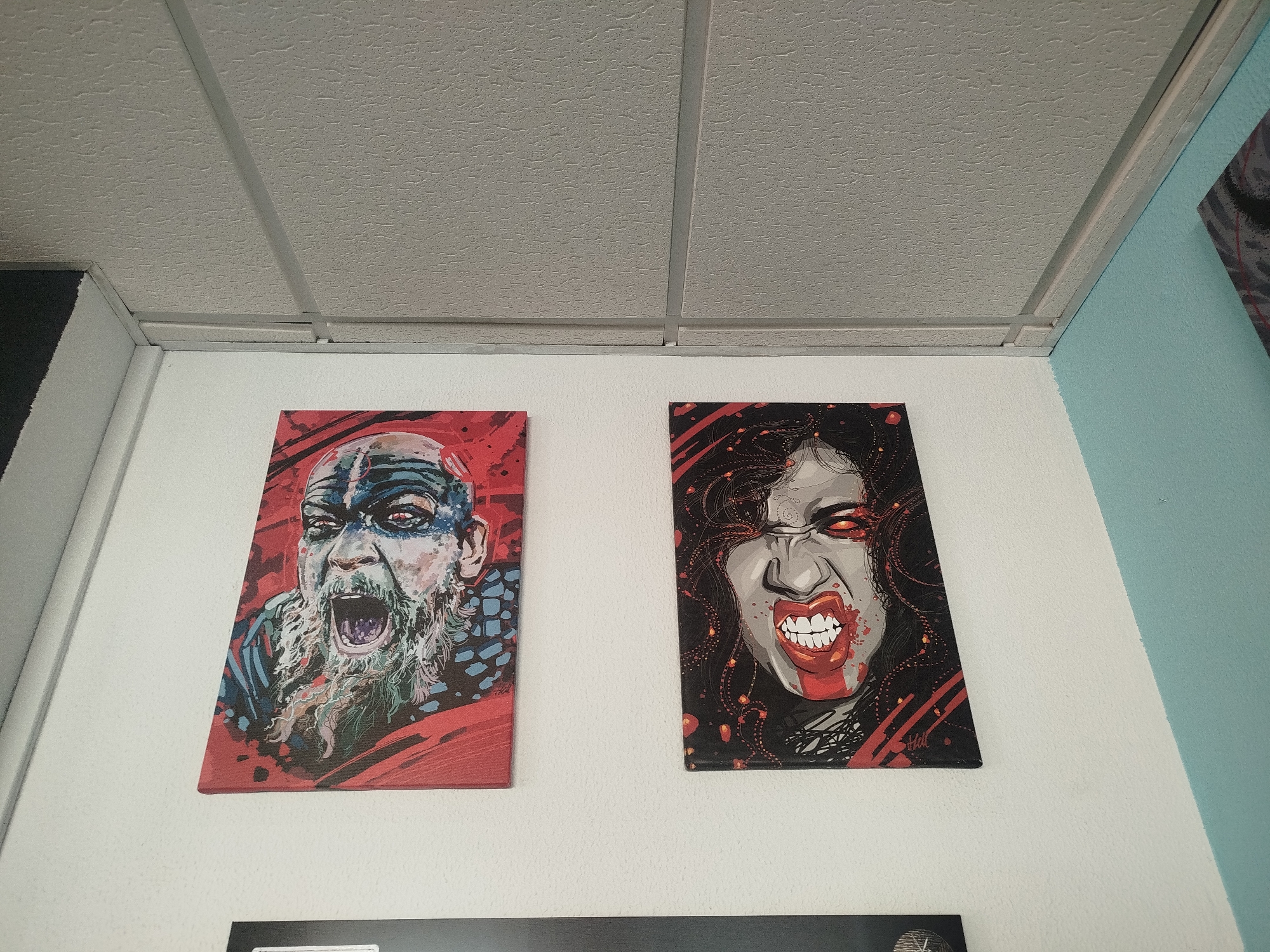 The image depicts two canvas prints hanging on a white wall. The left print features a bearded man with war paint, screaming. The right print portrays a woman with red accents and an intense expression. Above the prints is a suspended ceiling with visible gridwork. A section of a light blue wall is visible on the right. While the location is suggested as Guardamar del Segura, Spain, the image provides no visual confirmation of this.
