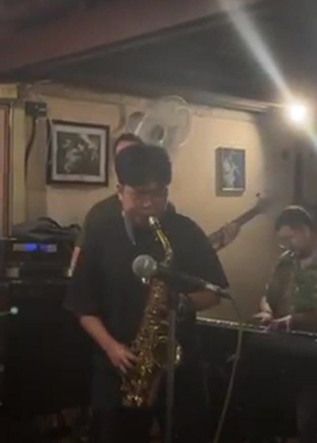 A young man with dark hair and glasses plays the saxophone in a dim, indoor venue. He stands centered in the frame, wearing a black t-shirt. Behind him are a bass player and a keyboardist, both men. The environment is cluttered with music equipment, including a keyboard, amplifiers, and cables. Framed pictures hang on the off-white walls. A fan is visible in the background. A partial view of a loft area with legs and feet is seen above. A microphone stands in front of the saxophonist.