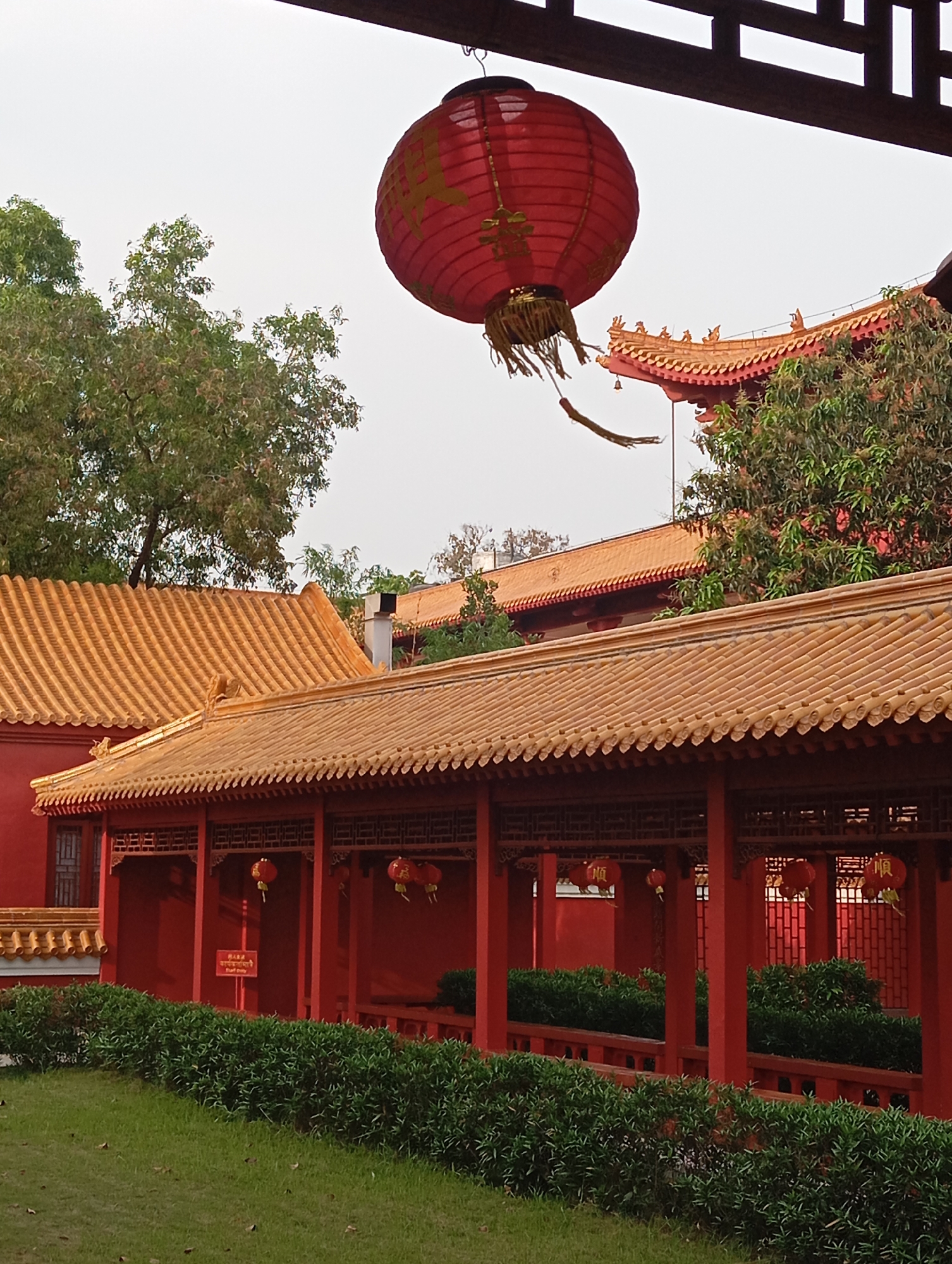 This image depicts a tranquil scene within a complex of Chinese-style temple architecture in Lumbini Sanskritik, Nepal