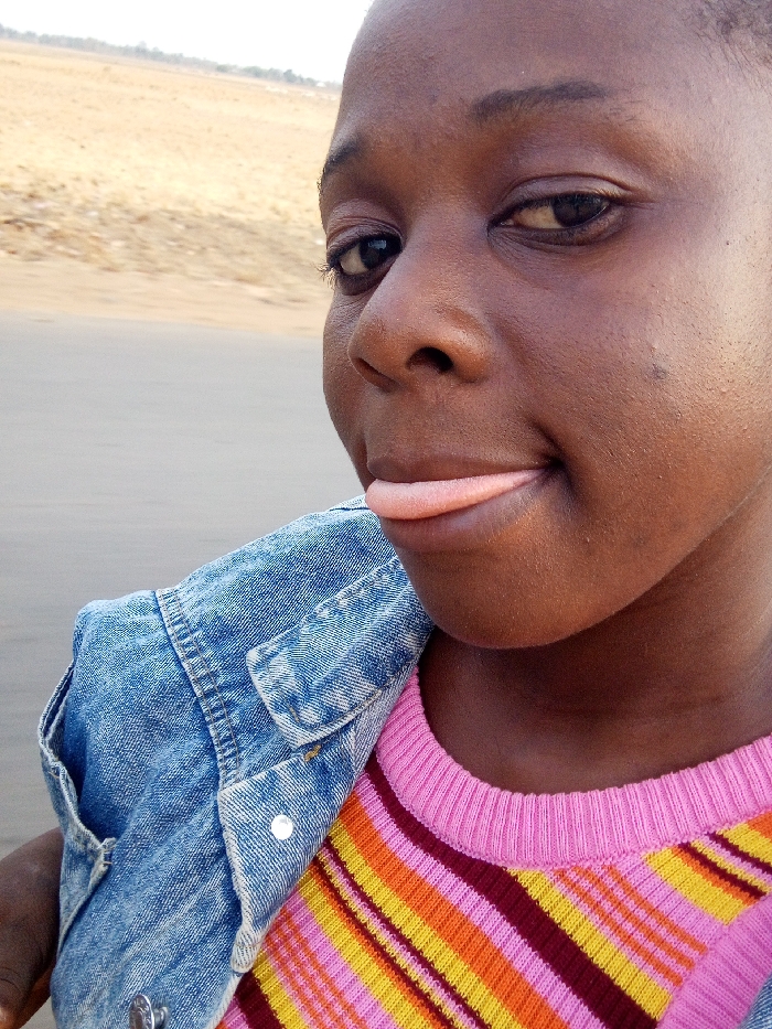 A young black girl is sticking out her tongue. She has dark brown skin and brown eyes. She is wearing a striped sweater with pink, yellow, orange, and maroon. A blue denim jacket covers one shoulder. The background is blurred and appears to be a road with tan, dry terrain in the distance. The image is a close-up shot of the girl's face, capturing her playful expression.