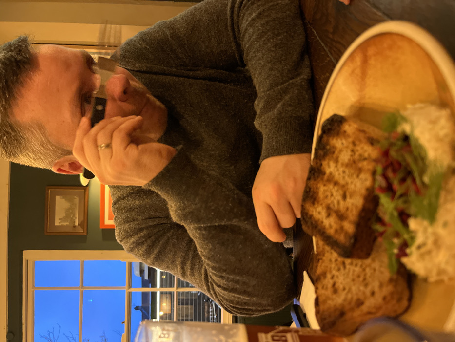 A man in a gray sweater is on a phone call in a room with dark green walls and a window with blue sky visible outside. He is seated at a wooden table with a plate of toast topped with a creamy spread and greenery, likely for a meal. The phone is held to his ear, and a wedding ring is visible on his finger. The composition is at an angle, capturing the scene from an elevated perspective.