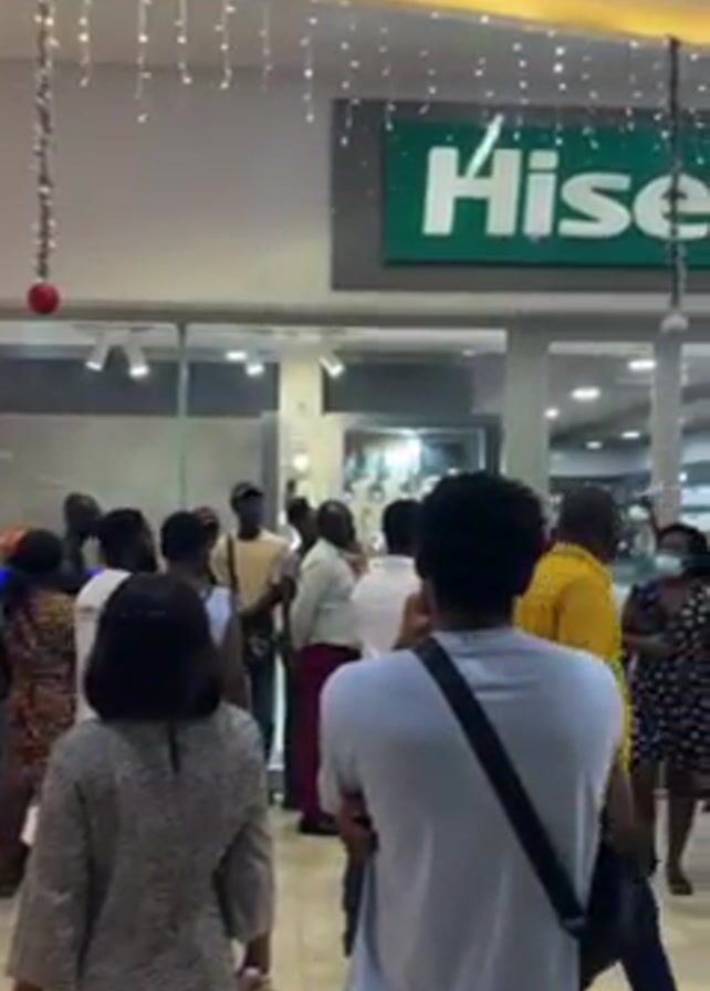large group of people gathered in what appears to be a shopping mall, possibly in front of a Hisense store