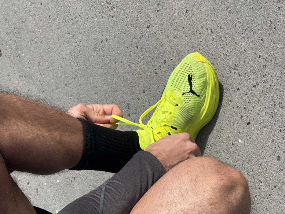 A person is tying the neon yellow laces of a Puma running shoe