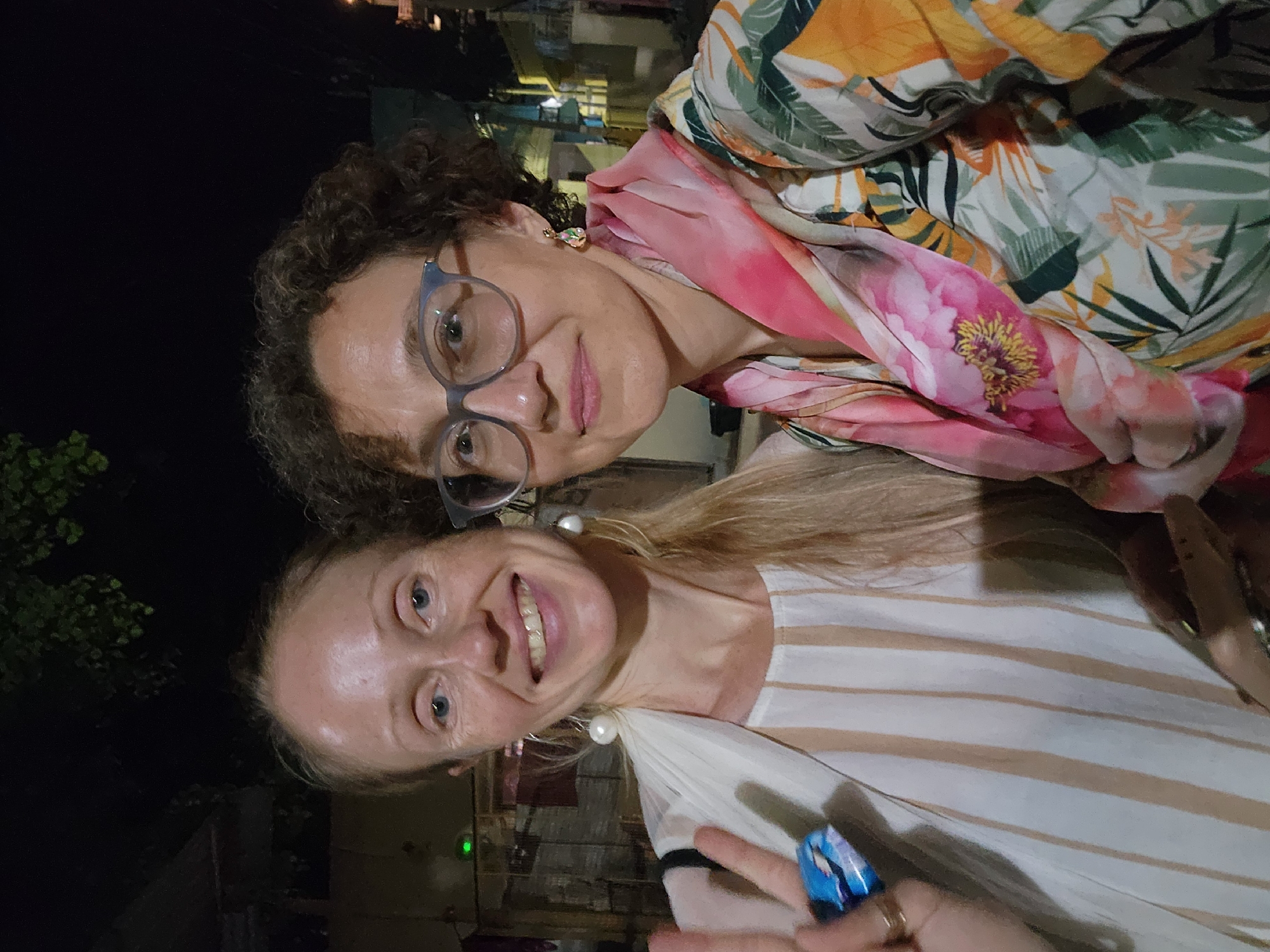 Two women are taking a selfie outdoors at night. The woman on the right has curly brown hair and glasses, and she is wearing a colorful scarf and earrings. The woman on the left has long blonde hair and is wearing a striped shirt and earrings. She is making a peace sign with her hand. The background is dark, but some buildings can be seen in the distance. The location is in the city of Unknown, Unknown.
