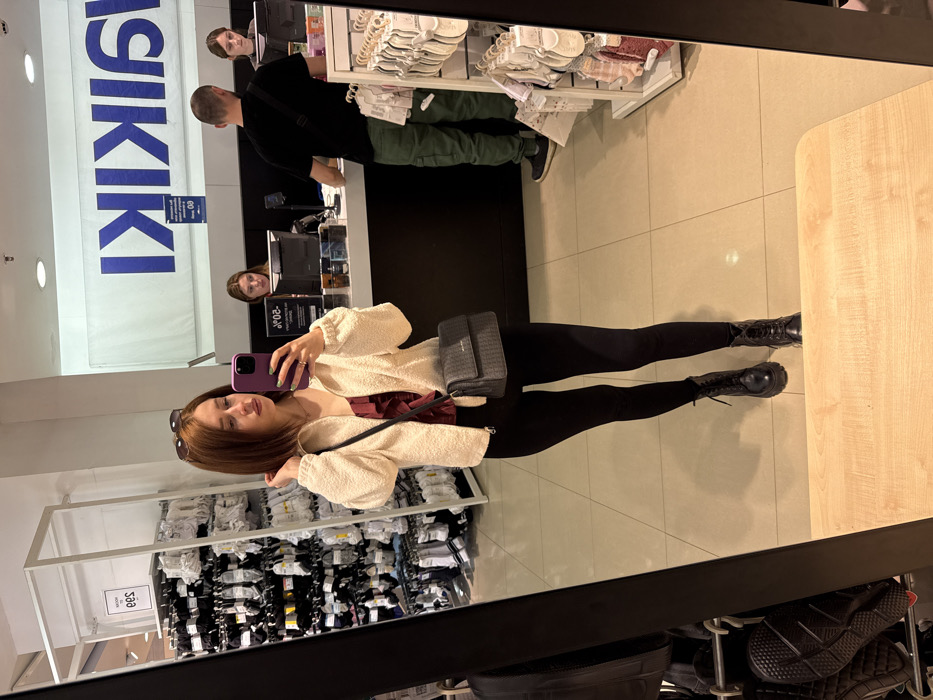 The image depicts a mirror selfie taken inside a retail clothing or general merchandise store, located in Rusanovo, Russia. The primary subject is a young adult female with shoulder-length reddish-brown hair, wearing sunglasses perched on her head. She is dressed in an off-white textured zip-up jacket, a burgundy ruffled top, black leggings, and black lace-up combat boots. She holds a purple smartphone in her left hand, appearing to operate the camera, and carries a gray patterned cross-body bag slung over her left shoulder. Her right hand is positioned near her hair. The flooring is composed of light-colored tiles. In the background, visible through the mirror's reflection: To the left of the primary subject, a white metal shelving unit displays numerous pairs of socks or small apparel items, predominantly in black and white. A white sign with mirrored text "22S" is affixed to the unit. To the right, a long, dark-colored counter serves as a checkout or service desk. Behind this counter, two female employees with blonde hair are seated, each attending to a computer monitor. A male customer, with short dark hair, wearing a black t-shirt, green cargo pants, and a black cross-body strap, stands at the counter, partially visible and facing away from the camera. Above the counter, a large white sign displays mirrored blue capital letters that appear as "IKIKI". Below this, a smaller sign indicates a "-20%" discount. Further to the right, a white display stand holds various light-colored, possibly packaged, apparel items such as baby clothes or intimate wear. The scene captures the primary subject taking a photograph, while individuals in the background are engaged in retail operations or transactions.