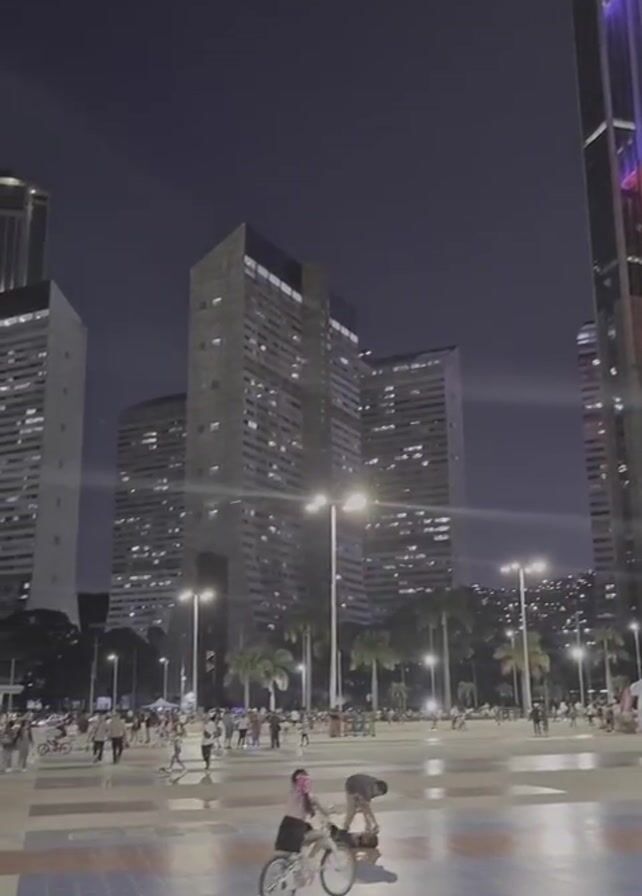 public square at night. The square is paved with a pattern of colored tiles. There are several tall buildings around the square, some illuminated with colored lights. Streetlights are also visible. Many people are in the square, walking, biking, skateboarding, and sitting. Some people are gathered in small groups. The overall scene is one of urban activity and recreation.