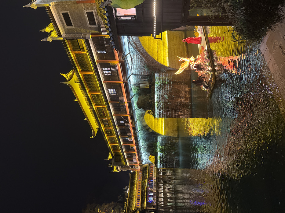 This nighttime image depicts the Hongqiao Bridge, also known as the Rainbow Bridge, located in Fenghuang Ancient Town, Fenghuang County, Hunan Province, China. The multi-arched stone bridge spans the Tuojiang River, featuring traditional Chinese architecture with two levels; the upper level is a covered walkway with distinctive upswept eaves. The bridge structure is extensively illuminated: the rooflines and upper sections glow with golden-yellow light, while the stone arches and piers below are lit with blue light, reflecting vibrantly on the river's surface. On the river in the foreground, a floating raft carries an illuminated golden phoenix sculpture with outstretched wings, surrounded by red and pink illuminated floral decorations. Two individuals are present on the raft: one stands on the right, dressed in a long, flowing red garment, facing left; another individual sits on the left, clad in dark clothing, appearing to play a stringed instrument. A third person in dark attire is partially visible near the seated musician. To the left of the main bridge, additional traditional buildings, possibly stilt houses, are visible along the riverbank, also illuminated with warm, golden light. To the immediate right, a dark wooden building with a lit window protrudes into the frame. The sky is dark, indicating night, and the ambient light sources primarily consist of the various artificial illuminations reflecting off the water.