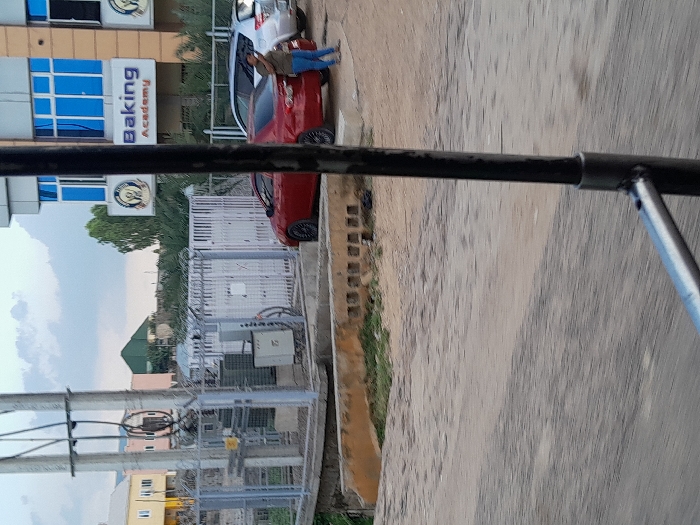 The image depicts an urban street scene in Hotoro North, Nigeria, under an overcast sky. In the foreground, a segment of an unpaved road occupies the lower left. To the left, a tall utility pole structure supports multiple electrical lines, with associated electrical equipment enclosed within a chain-link fence topped with barbed wire. A red four-door sedan with dark rims is parked, facing left, immediately to the right of the utility enclosure. A person, dressed in blue jeans and a light brown top, stands beside the driver's side rear door of the red sedan. A silver hatchback is parked directly behind the red sedan. In the midground, a multi-story building with blue-tinted windows is visible. A prominent sign on this building reads "Baking Academy" in blue lettering, accompanied by a circular logo featuring a stylized culinary image. Further in the background to the left, multiple residential buildings with distinct colors (yellow, pink, green-roofed) are present. A dark metal pole and an attached horizontal bar partially obscure the right side of the foreground, indicating the perspective is likely from a vehicle.