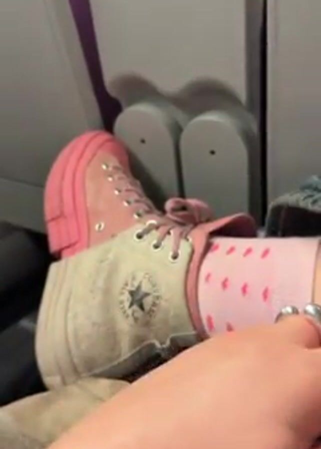 . The video shows a person on an airplane. They are wearing pink and white Converse high-top sneakers and pink socks with a heart pattern. The person is also wearing denim jeans. The airplane seat is beige. The person’s hand, which is wearing rings and has painted nails, is visible near their leg. The airplane window shade is up.