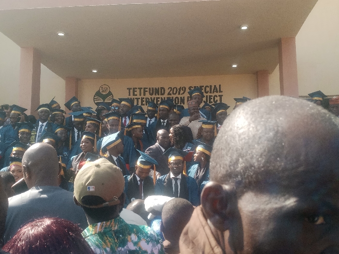 The scene depicts an outdoor daytime gathering in Gwafan, Nigeria, set against a light-colored building wall. Prominently displayed on the wall is partially visible text reading "TETFUND 2019 SPECIAL INTERVENTION PROJECT" and a circular logo to its left. Directly beneath an overhang, which features recessed lighting fixtures, a large group of adults is positioned, primarily clad in dark academic gowns and mortarboard caps with yellow or gold accents. Individuals in the immediate foreground, whose backs are towards the camera, include a person with very short dark hair, another in a grey t-shirt, and a third wearing a beige baseball cap with a dark logo. One person within the group in academic attire is observed holding a smartphone, directed towards the assembly. The group is densely arranged, indicating a formal event.