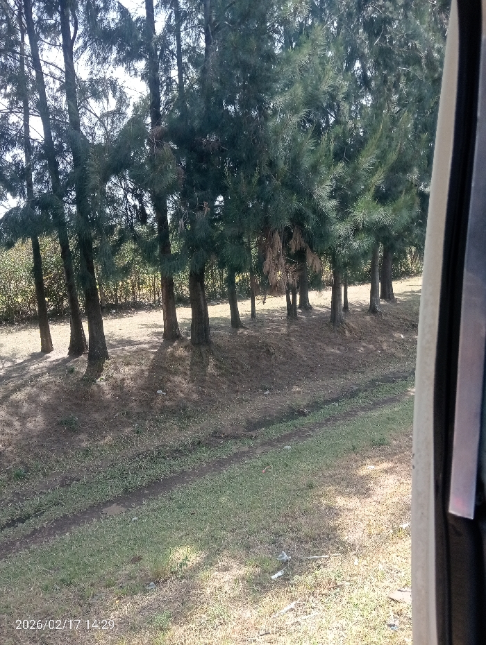 A daytime exterior photograph, captured from inside a vehicle, depicts a natural roadside environment in Mosop ward, Kenya. The right edge of the frame shows a portion of a light-colored vehicle window frame and dark interior. The foreground consists of dry earth sparsely covered with light green grass, traversed horizontally by a distinct, unpaved dirt track. Small pieces of white debris are scattered on the ground. Elongated shadows from trees extend across the lower half of the scene, indicating afternoon sun, confirmed by the timestamp 2026/02/17 14:29. The midground features a linear arrangement of approximately ten tall, slender trees with dense, dark green needle-like foliage, positioned on a slight incline of dry earth. The background reveals denser green bush-like foliage and a clear, bright sky. No people, animals, or identifiable structures are present in the observable scene.