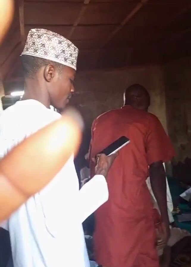 interior of a room with several people inside. The walls appear to be made of mud or stucco. The floor is covered with rugs. A man in a white garment and patterned cap walks through the room, looking at his cell phone. Another man, wearing a red outfit, bends over to interact with someone seated on the floor. A third man in a white robe stands in the background. Other people are visible in the background, either sitting or standing. The lighting is uneven. A hand briefly comes into focus in the foreground.