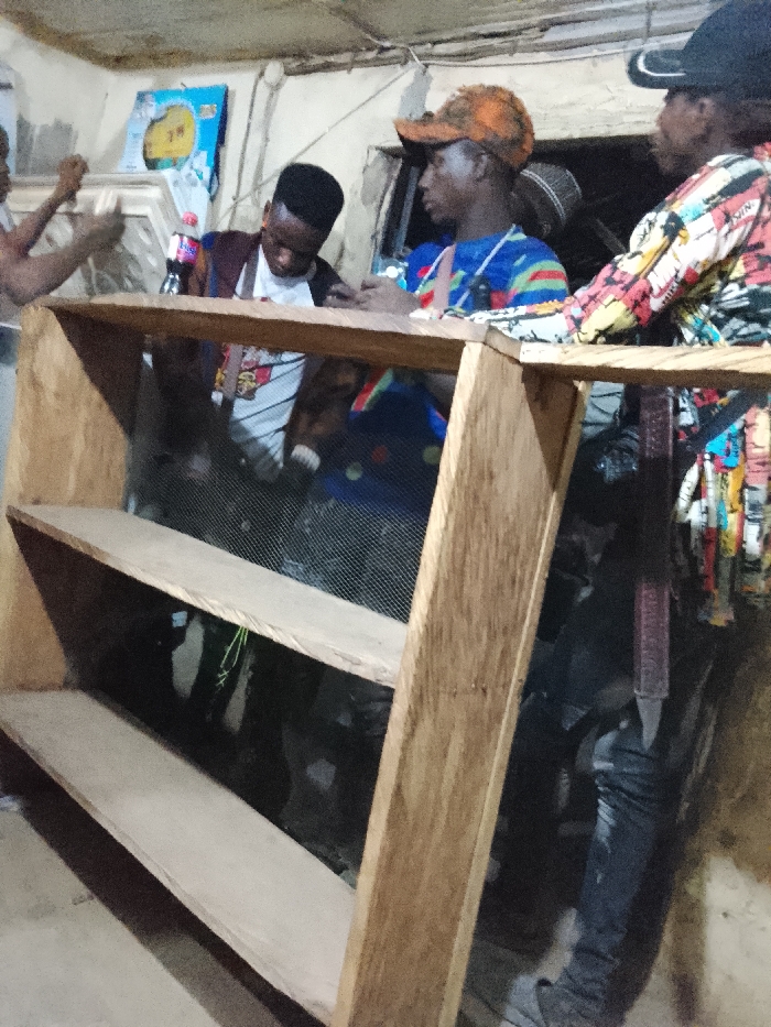 An unfinished, light-colored wooden shelf stands at an angle with two empty shelves. Three young men stand behind it. One wears an orange hat and a striped shirt. Another has a black hairstyle and a white t-shirt with a graphic. The third wears a black hat and a multi-colored shirt with dark jeans. Behind the shelf is a wall with an illustration and dark mesh.