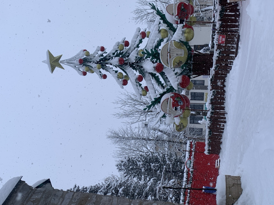 A whimsical Christmas tree stands laden with snow, adorned with red and gold baubles and a star topper. It's a winter scene with fresh snow covering the ground and trees. A red and brown fence stands nearby, with buildings in the background partially obscured by snowfall. It appears to be an outdoor display, likely on a property.