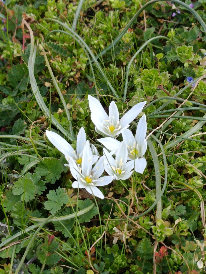 The image displays a close-up, ground-level view of natural vegetation located in Ignatievo, Bulgaria. The central focus is a cluster of five white, star-shaped flowers, each exhibiting a prominent yellow center composed of stamens and pistils. These flowers are surrounded by a diverse array of green plants: numerous thin, elongated blades of light-green grass curve and cross through the frame, while broader-leafed, deeply lobed green plants are visible in the foreground and mid-ground. The background consists of varied green foliage, including smaller, more compact plant structures, and a few small, distant purple-blue flowers in the upper-right quadrant. Sparse reddish-brown vegetation is also present. The scene is illuminated by natural light, indicating an outdoor environment. No people, animals, or artificial objects are present.