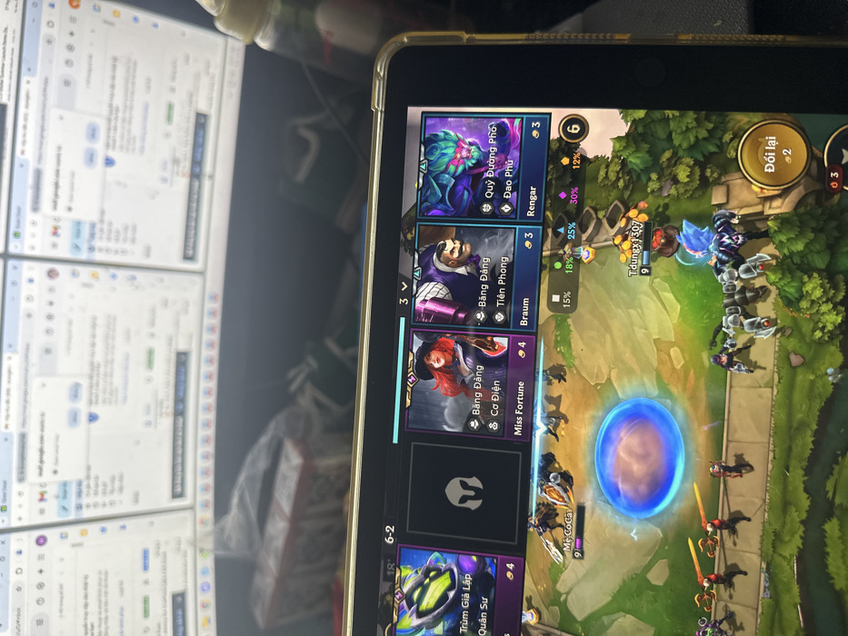 close-up of a tablet screen displaying a game of League of Legends, a popular online battle arena video game. The screen shows the in-game characters, their levels, and the game interface. The tablet is resting on a desk in front of a computer monitor displaying open web browser windows. The game is in progress, with the score being 6-2. The image is located in Vũng Tàu, Vietnam, at the coordinates 10.366 latitude, 107.1 longitude. The image suggests that the person is playing League of Legends in their home in Vũng Tàu.