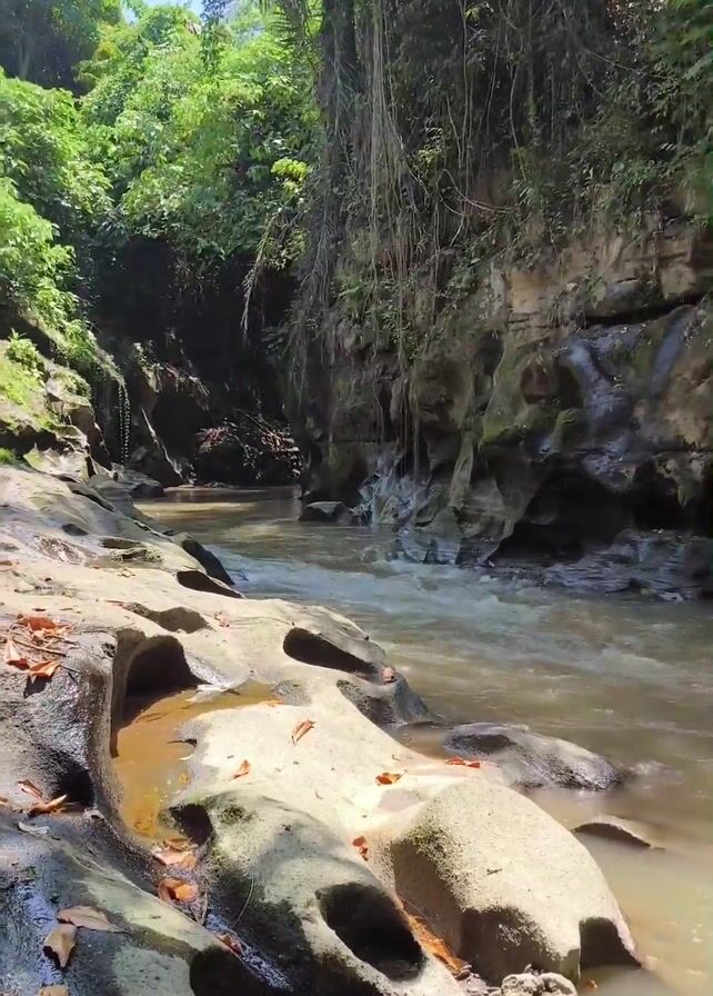 The video depicts a river flowing between rocky cliffs in a tropical environment