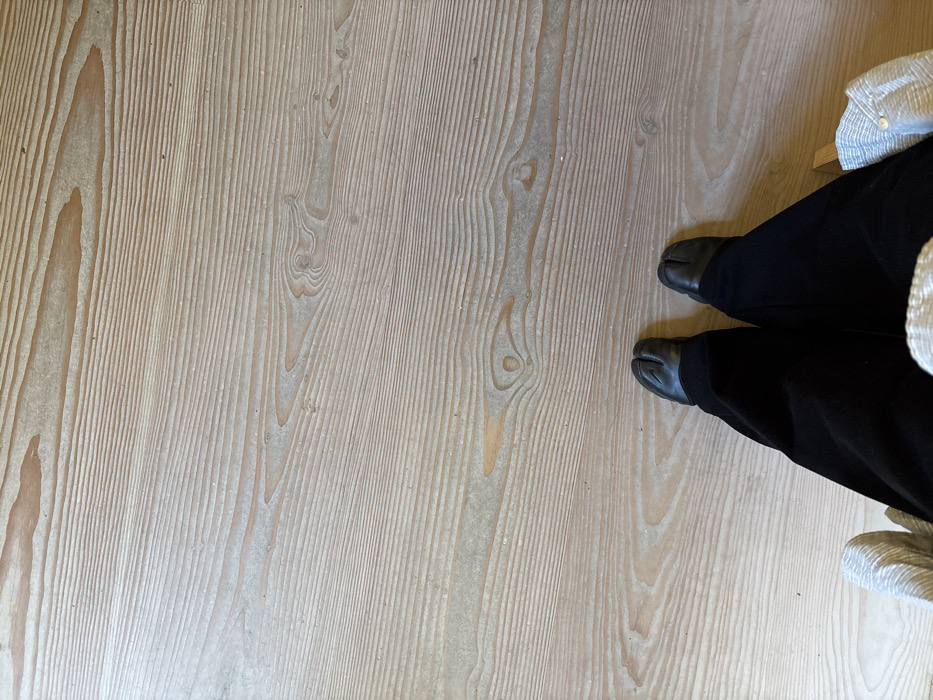 A high-angle overhead shot depicts the lower body of a seated individual in an indoor setting within the city of London, United Kingdom. The subject's legs are extended forward, clad in dark, possibly black, trousers. They wear black split-toe (tabi-style) shoes. The feet are positioned slightly apart, resting on a light-toned wooden floor composed of wide planks featuring distinct, visible wood grain patterns and occasional knots. Faint traces of wear or dust are visible on the floor surface. Partial views of light-colored, textured fabric, likely an armrest or clothing, are visible at the extreme bottom left and right edges of the frame, flanking the subject's legs. No active movement or interaction is depicted. The environment appears to be a well-lit, minimalist room.