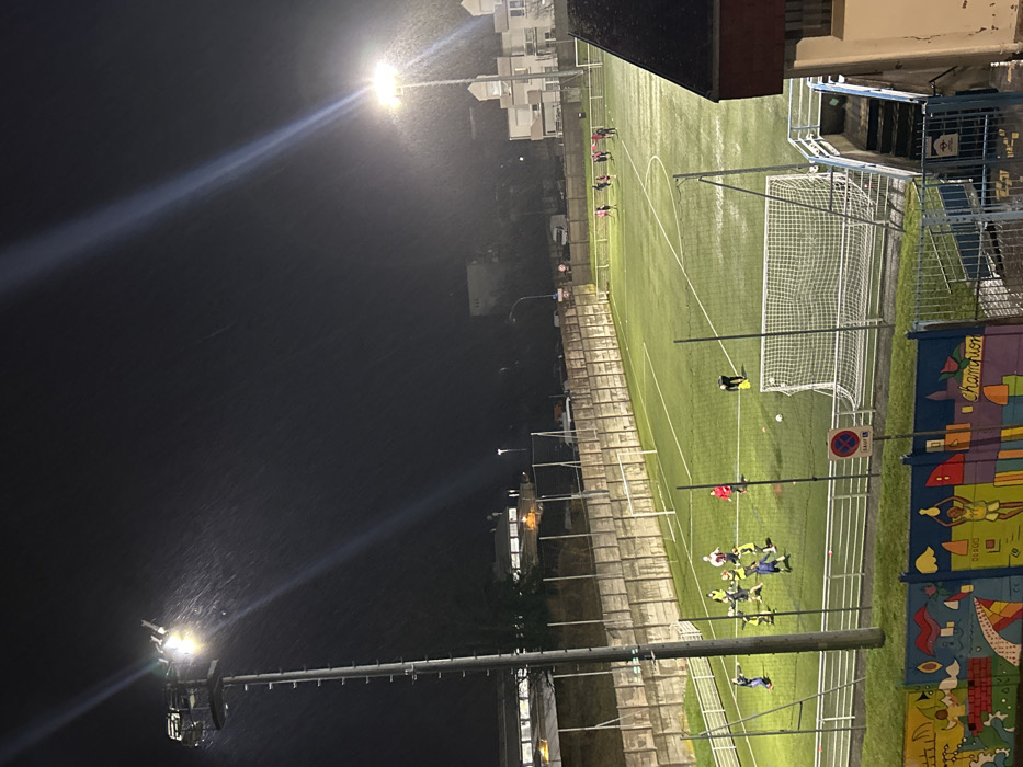 A brightly lit soccer field at night, likely during heavy rain. A soccer team is practicing on the field. Lights positioned high on towers illuminate the scene, with the rain visibly illuminated in their beams. A building flanks one side of the field, featuring an ornate painted fence. Stairs lead to a higher vantage point. The focus is clearly on the soccer field activity.