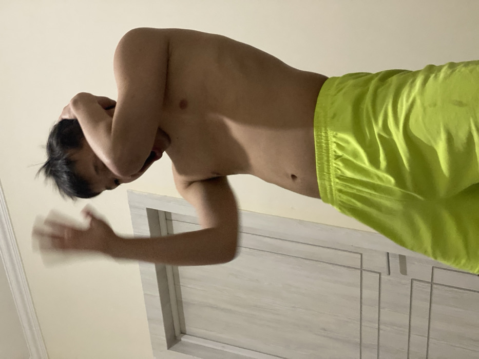A shirtless Asian man, wearing bright green shorts, stands with his head down and arms raised, partially obscuring his face. He is positioned in front of a white panelled door. His torso is angled slightly, with a noticeable chest and abdomen. His left hand is blurred, suggesting movement. The background consists of a beige-toned wall and the lower portion of the white door with vertical panels. The lighting is generally soft, causing some shadowing.
