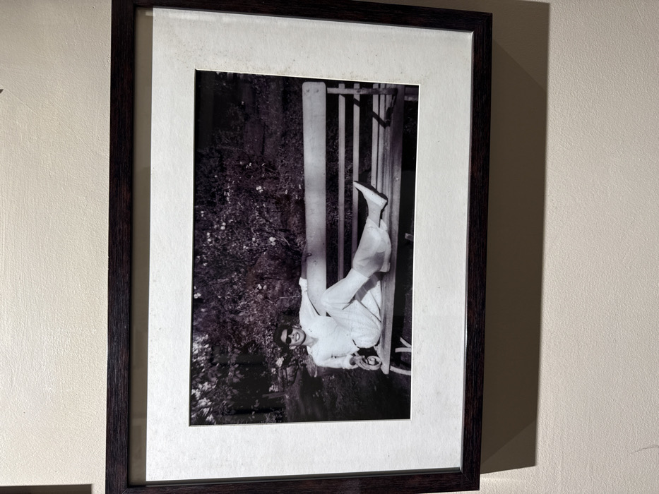 A black and white photograph, framed in dark brown with a white mat, is affixed to a light-colored wall in the city of Zanzibar, Tanzania