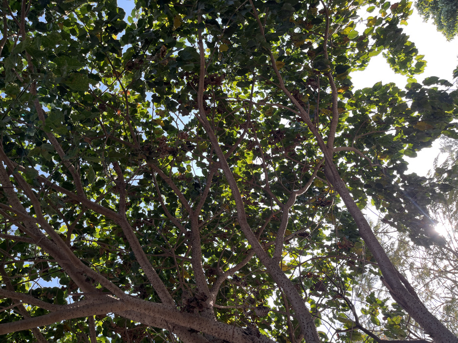 Looking up into a densely branched tree with mottled bark and green leaves backlit by the sun