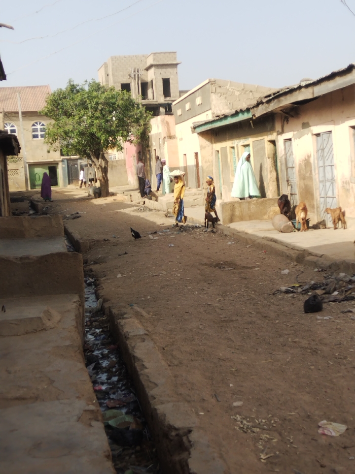 This image depicts an unpaved, dusty street in Kaura Goje, Nigeria, under a clear, light sky