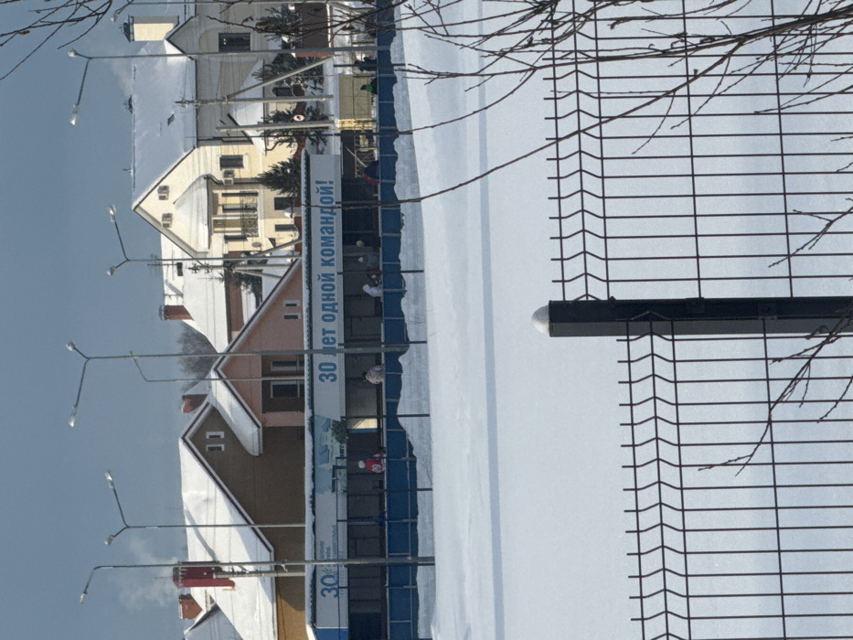 This image depicts a winter scene in an outdoor area of Unknown, Unknown, under a partially cloudy blue sky. In the foreground, a dark grey metal wire mesh fence with square posts stands, partially obscured on the right by bare tree branches. A thick layer of undisturbed white snow covers the ground immediately behind the fence. In the midground, a long, low structure with a blue base and multiple window-like openings is visible. A large white banner is affixed to this structure, bearing the blue Cyrillic text "30 лет одной командой!" ("30 years of one team!"). Inside the structure, several people are present; one individual on the left wears a red jacket with the number "29" on the back, while others appear to be standing or sitting in dark winter clothing, suggesting an ice rink enclosure. The background features several residential houses with steeply pitched roofs uniformly covered in snow. These include a brown house with a visible red chimney emitting a faint wisp of smoke, a light pink house, and a cream-colored house with a small balcony feature. Multiple tall, dark grey streetlights with double-arm fixtures extend upwards, positioned behind and above the midground structure and houses.