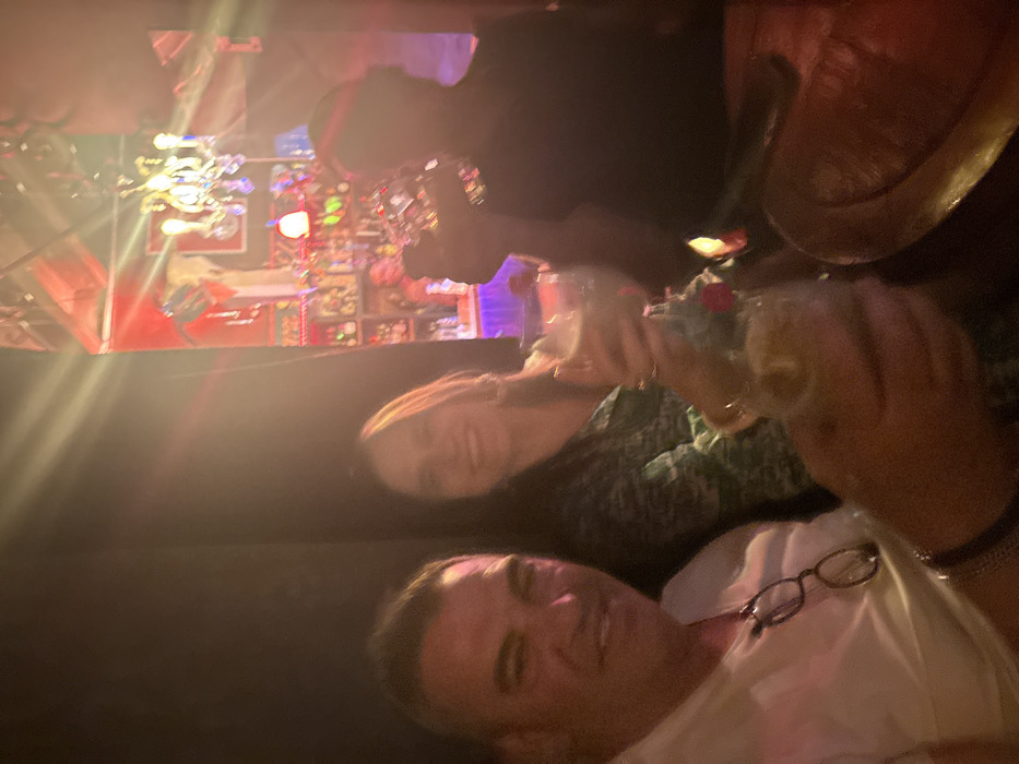 Three individuals are in a dimly lit setting, possibly a bar. The person in the foreground, a man with glasses, wears a white shirt. A woman sits beside him in a green patterned top. In the background, another person is holding up a decorated drink. Various decorative elements, including a chandelier, are visible adding to the ambience.