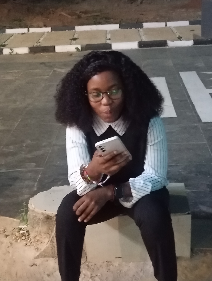 A young woman with curly hair and glasses sits, looking at her white smartphone. She wears a white striped shirt with a black vest, and black pants. She has a watch and bracelets on her left wrist. The background shows pavement and low concrete blocks with painted white and black stripes. The scene is dimly lit.