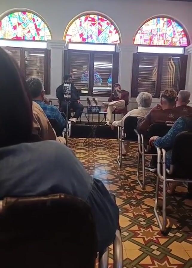 small audience listening to a conversation on stage. The stage has a small table with two microphones on it. Two people are sitting on chairs, one on each side of the table. The audience is seated in rows of chairs facing the stage. The room has three arched windows with stained glass at the top. The floor is covered in patterned tile. A person in the audience is recording the event with a phone.