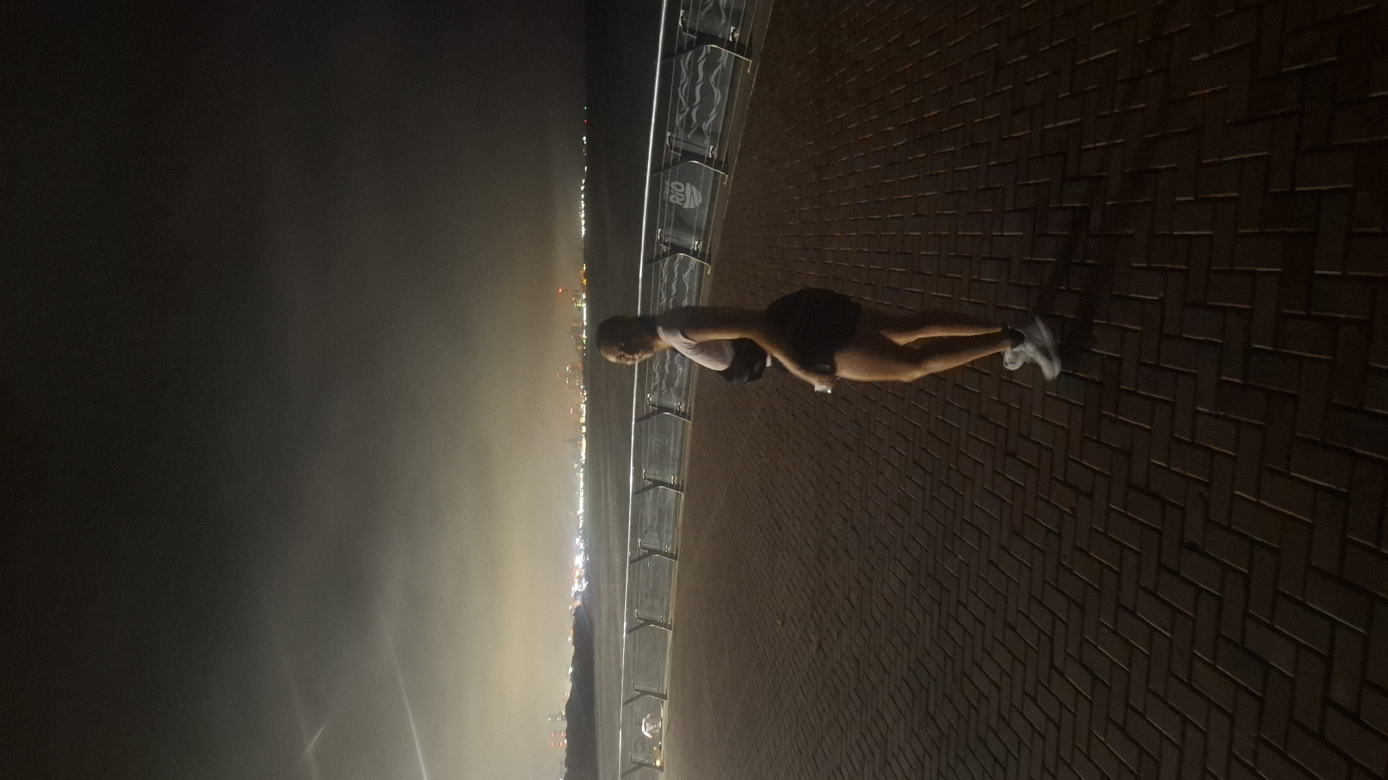 A photograph taken at night shows a person standing on a brick pathway next to a metal railing overlooking a body of water with a cityscape visible in the distance