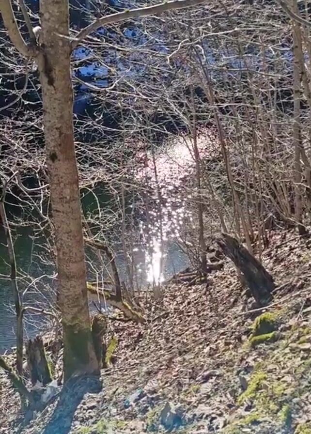 The scene is a woodland area with a body of water visible through the trees. The trees are mostly bare, with only a few small branches visible. The ground is covered with fallen leaves and twigs. The sun is shining brightly and reflecting off the water, creating a sparkling effect. The overall tone of the video is peaceful and serene.