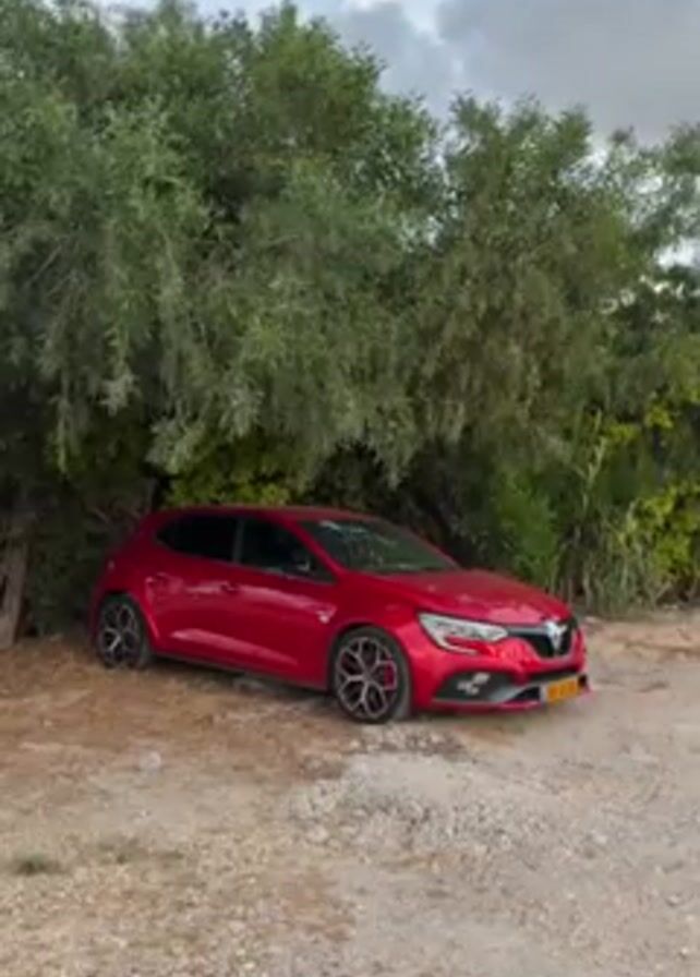 Here's a detailed description of the video: The video shows a red Renault Megane RS parked near a lush, green tree line
