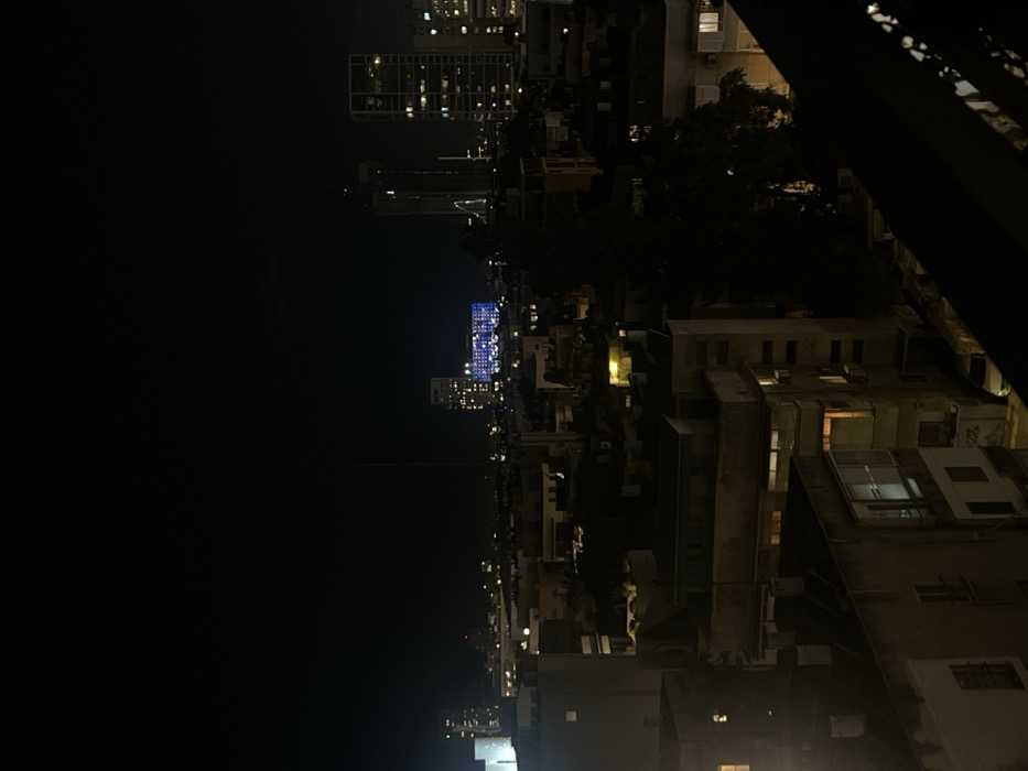The image displays a nighttime cityscape in Tel Aviv, Israel, viewed from an elevated position. The foreground is partially obscured by a dark, angled railing or architectural element on the lower right. Below this, the roofs and upper floors of multiple low-to-mid-rise buildings are visible, characterized by varied architecture and illuminated windows, suggesting residential or mixed-use structures. A white vehicle is parked on a street in the lower right. In the mid-ground, a dark, dense tree stands prominently to the right, with further urban structures extending into the distance. The background skyline features several modern high-rise buildings. Most notably, in the center-right background, a multi-story building is distinctly illuminated with blue light, identifiable as the Azrieli Sarona Tower. To its right, a tall skyscraper with a prominent grid-like facade is visible, likely one of the Azrieli Center towers. Other lit high-rises are present across the background, indicating the dense urban core of Tel Aviv. The sky is dark, consistent with nighttime conditions. No individuals, explicit actions, or interactions are discernible within the frame.