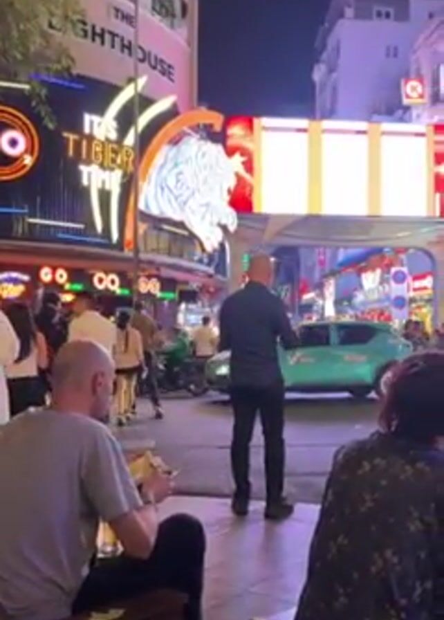 bustling city street at night, presumably in Southeast Asia. Buildings are adorned with bright, colorful neon signs, including brands like Tiger Beer and Carlsberg. People are sitting at outdoor tables along the sidewalk, watching the traffic and pedestrians. A man in a black shirt and pants stands on the sidewalk, appearing to gesture or speak towards the street. Traffic includes cars, taxis, and scooters. The video pans to capture more of the street scene and neon signage.