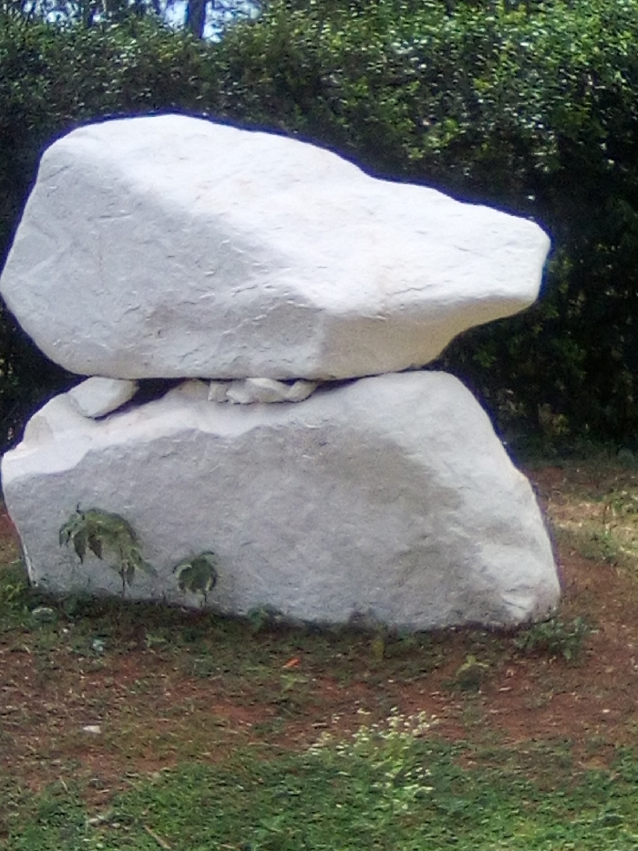 The image depicts a static outdoor scene in South Sakwa ward, Kenya. Two large, irregularly shaped, light-colored rocks are stacked vertically. The lower rock, greyish-white and substantial, rests on reddish-brown soil interspersed with patches of green grass. A second, similarly colored rock is balanced on top of the first, separated by several smaller, irregular stones acting as supports. Two small green plants are visible growing near the base of the lower rock. The background consists of dense green foliage, indicative of trees or bushes. No individuals, actions, or interactions are present within the frame.